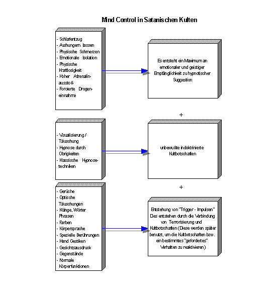 Aufsätze - Ritueller Mißbrauch 4. Mind Control-Techniken Mind Control wird in den deutschen Übersetzungen amerikanischer Fachliteratur meist mit "Bewußtseinskontrolle" übersetzt. In dieser Verkürzung wird übersehen, das sich ein Teil der hier angewandten Techniken auch auf das Unterbewußtsein bezieht. Aus diesem Grund wird in den folgenden Ausführungen der Begriff der "Mind Control" beibehalten.Mind Control ist ein entscheidendes Merkmal und Beurteilungskriterium für die Tätigkeiten und Handlungen einer Gruppierung. Dies gilt insbesondere für religiöse und ideologische Gruppierung jeglicher Art. Zunehmend werden Techniken der Mind Control aber auch im Bereich der organisierten Kinderpornographie und Kinderprostitution verwandt. Ziel von Mind Control ist die Erlangung totaler Herrschaft über das Opfer und die Schaffung von Abhängigkeitsstrukturen. Hierzu wird eine Vielfalt von Techniken verwandt und kombiniert, so beispielsweise Manipulation, Indoktrination, Konditionierung, Codierung / Programmierung und "Gehirnwäsche". 4.1. Definition von Mind Control ("Bewußtseinskontrolle") Mind-Control ist "ein System von Einflüssen, mit dem die Identität des Individuums (seine Überzeugung, sein Verhalten, Denken und Fühlen) zerbrochen und durch eine neue Identität ersetzt wird." (nach Hassan, Steve; Combatting Mind Control; Deutsch: Ausbruch aus dem Bann der Sekten; Reinbek, 1993; S. 25). "Ziel und Zweck der Mind Control ist es, Kontrolle und Hörigkeit über das Opfer oder des Überlebenden sowohl während des Mißbrauchs und der Rituale und während des `normalen Lebens´ des Opfers zu bekommen." (Tagungs-Handout der Ritualistic Abuse Consultancy, Sydney). Bislang gibt es wenige Veröffentlichungen und sehr wenige Untersuchungen über Mind Control. Entscheidende Erkenntnisse entstammen den Untersuchungen des amerikanischen Psychologen Robert J. Lifton über die Gehirnwäsche im Koreakrieg (Robert J. Lifton; Thougt Reform and the Psychology of Totalism - A Study of Brainwashing in China; New York, 1961). Diese Erkenntnisse hat Lifton in den achtziger Jahren in der Diskussion um die "destructive cults" in den USA überarbeitet und hieraus ein Modell entwickelt, wie ein Prozeß der Mind Control funktioniert.4.2. Kriterien zu Mind Control Als Leitlinie für eine näheren Untersuchung zur Anwendung von Mind Control benennt Lifton folgende acht Kriterien: